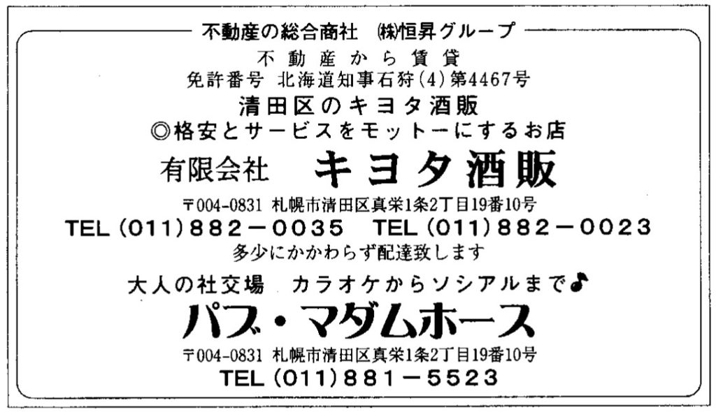 2001年8月1日発行 清田地区町内会連合会「連合会だより」には、協賛広告として「パブ・マダムホース」が記載されていました。このころには、看板はまだ存在していたはずです。